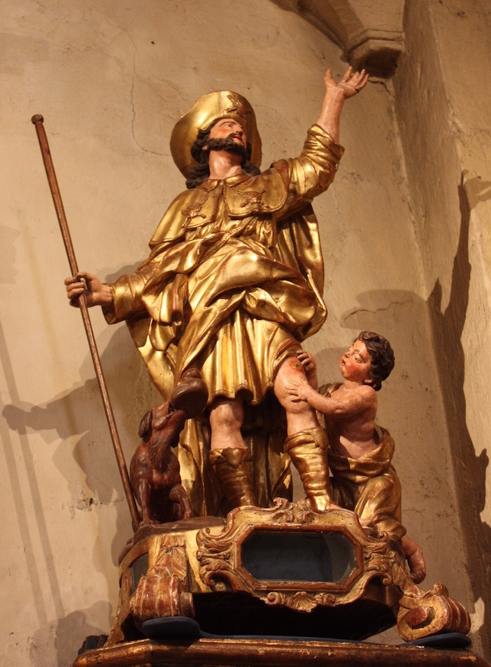 En définitive, face à l’inexplicable, c’est la colère de Dieu, qui provoque la peste. Il reste au chrétien à trouver un intercesseur pour l’aider à apaiser cette colère. Saint Sébastien et Saint Roch sont les plus habituels des saints priés pour conjurer la peste. J’ai déjà parlé du lien de Saint Sébastien et de la peste. C’est un lien métaphorique, les flèches qui transpercent Sébastien étant assimilées aux flèches d’Apollon devenant la peste des grecs dans le siège de Troie. C’est donc très intellectuel. Les clercs de l’époque baroque devaient y montrer avec plaisir leur science. De plus la semi-nudité de Sébastien rappelait les statues antiques.