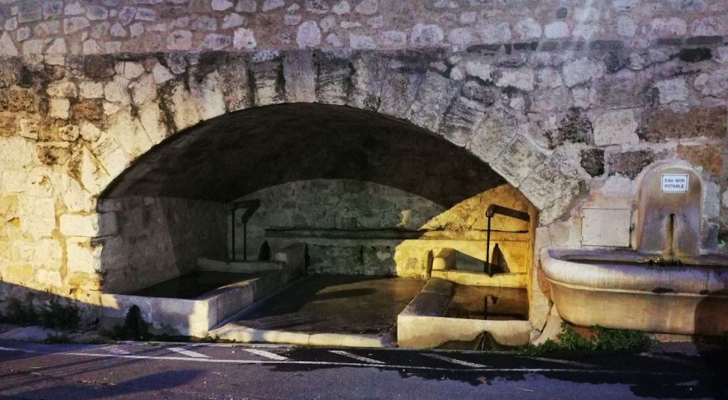 A Pertuis, face à la rue de la Dévalade qui descend vers le cours d’eau de l’Eze se trouve le lavoir des Poux. Il a été construit en 1882, encastré dans le rempart. Marie-Thérèse Fouilhé[1] propose deux explications à cette appellation curieuse. La première, traditionnelle, est qu’il y avait beaucoup de poux à cause de l’abreuvoir à chevaux qui se trouve à coté, la seconde est que ce lavoir avait une porte, faite de planches de bois, des « paulx » , devenu « pevou » (poux) par approximations successives.