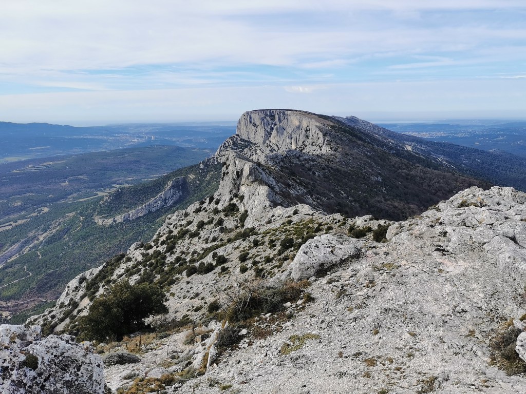 Sa crête est comme une lame, entre la pente abrupte du Nord et la falaise du Sud. Elle semble le récif d’une calanque perdue au milieu des terres. De son sommet, le pic des mouches à 1011 mètres, les marcheurs aperçoivent tout en bas le barrage Zola, cet ouvrage créé par le père de l’écrivain, qui forme la retenue d’eau qui alimente Aix en Provence. Au loin, on peut voir le Ventoux derrière le Luberon, et de l’autre coté les montagnes qui entourent Aubagne.