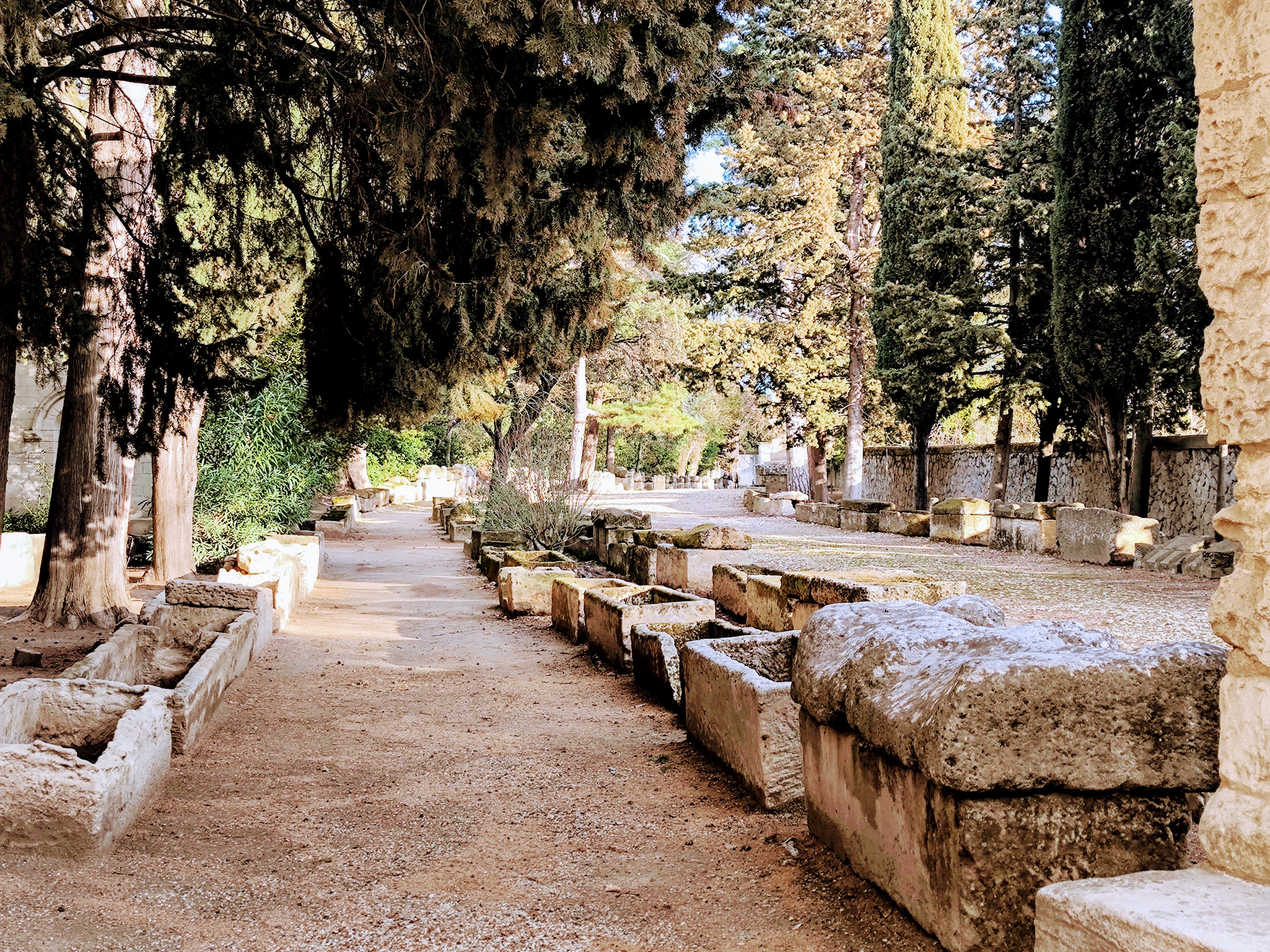 Les Alyscamps sont un des derniers cimetières romains conservé, avec les catacombes de Rome, ou la voie des tombeaux de Pompei. Dans la lumière rasante du soir, et le silence d’un lieu d’où les touristes étaient partis, on pouvait sentir la présence de tous ces morts. Ce fut un instant fugace où j’ai eu l’impression de vivre au milieu des anciens.