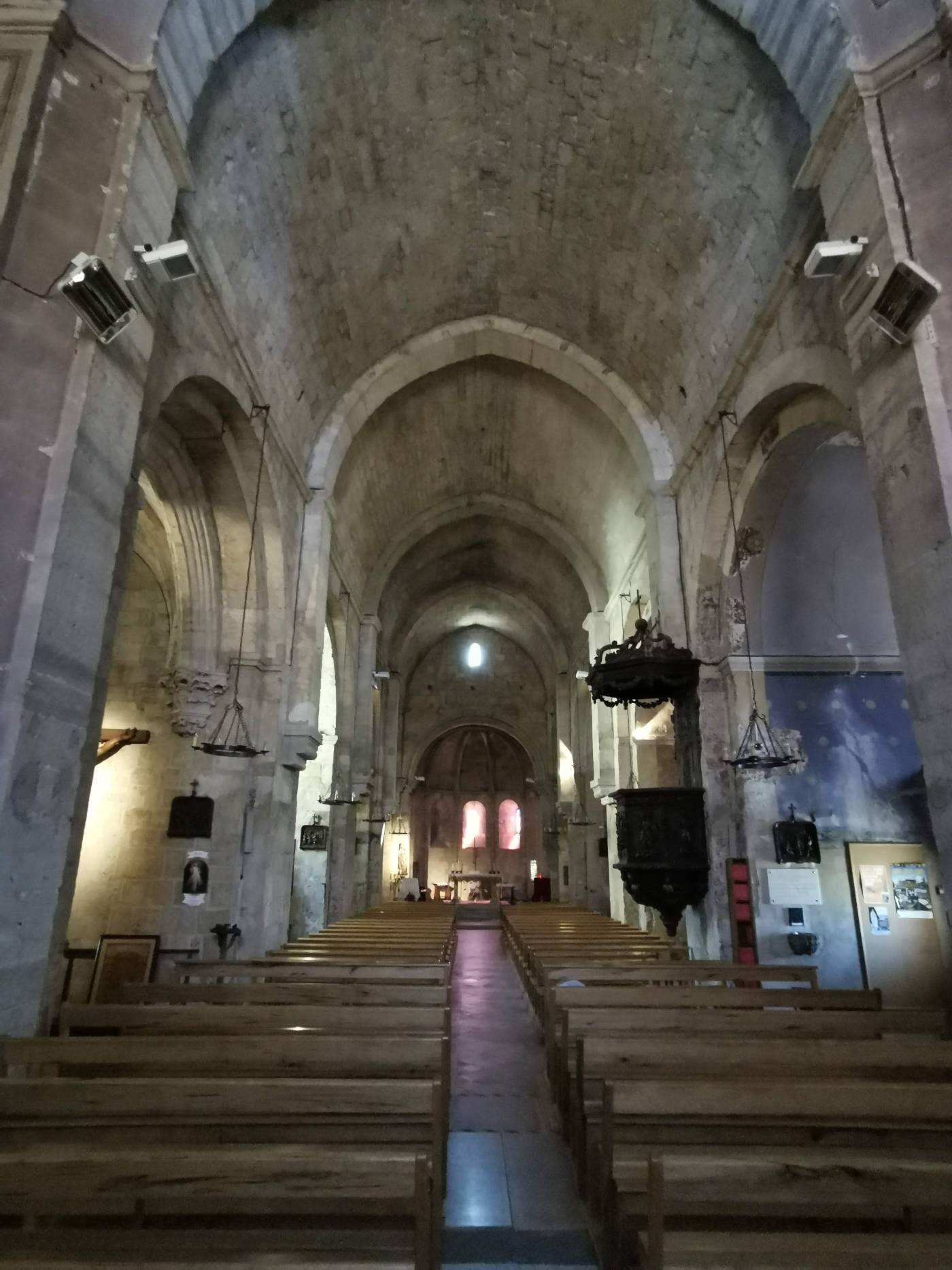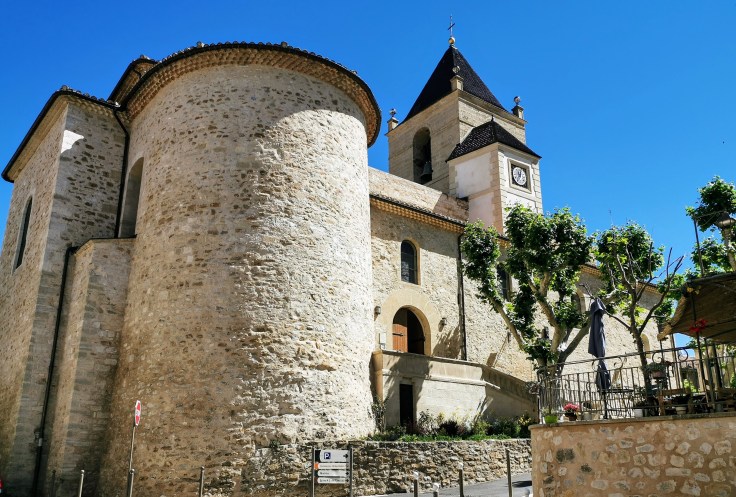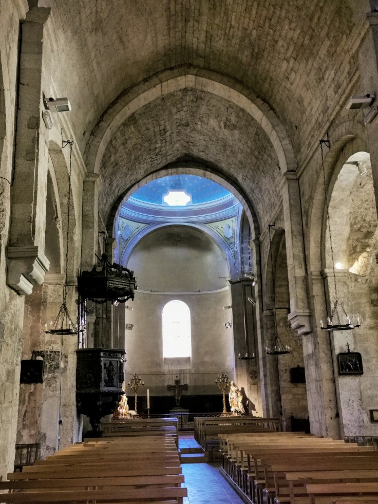 Une église, c’est un cercle et un rectangle. Un rectangle pour la nef où se rassemble l’ekklesia, l’assemblée des fidèles. Un cercle pour le chœur où le prêtre célèbre la messe. Ces deux formes de base se voient encore bien à Notre Dame de Romengas, l’église de la Tour d’Aigues. Des chapelles de bas-côté ont été ajoutées, ainsi qu’une deuxième abside sur laquelle je reviendrai. L’église est montée sur un promontoire qui surplombe la rue principale du village. Celle-ci tourne autour à l’ouest et au nord de l’église. De ce fait, l’entrée est au sud. A l’intérieur la structure de base est toujours bien visible, la nef avec sa voute en arc brisé, caractéristique du roman provençal, le chœur fermé par un arc de cercle structuré par des colonnettes. Celles-ci se prolongent dans la voute en demi-lune, attirant irrésistiblement le regard vers le haut, vers l’étoile qui entoure la clé de voute. La cérémonie qui se déroule fait le lien entre les fidèles et le paradis qui nous domine.