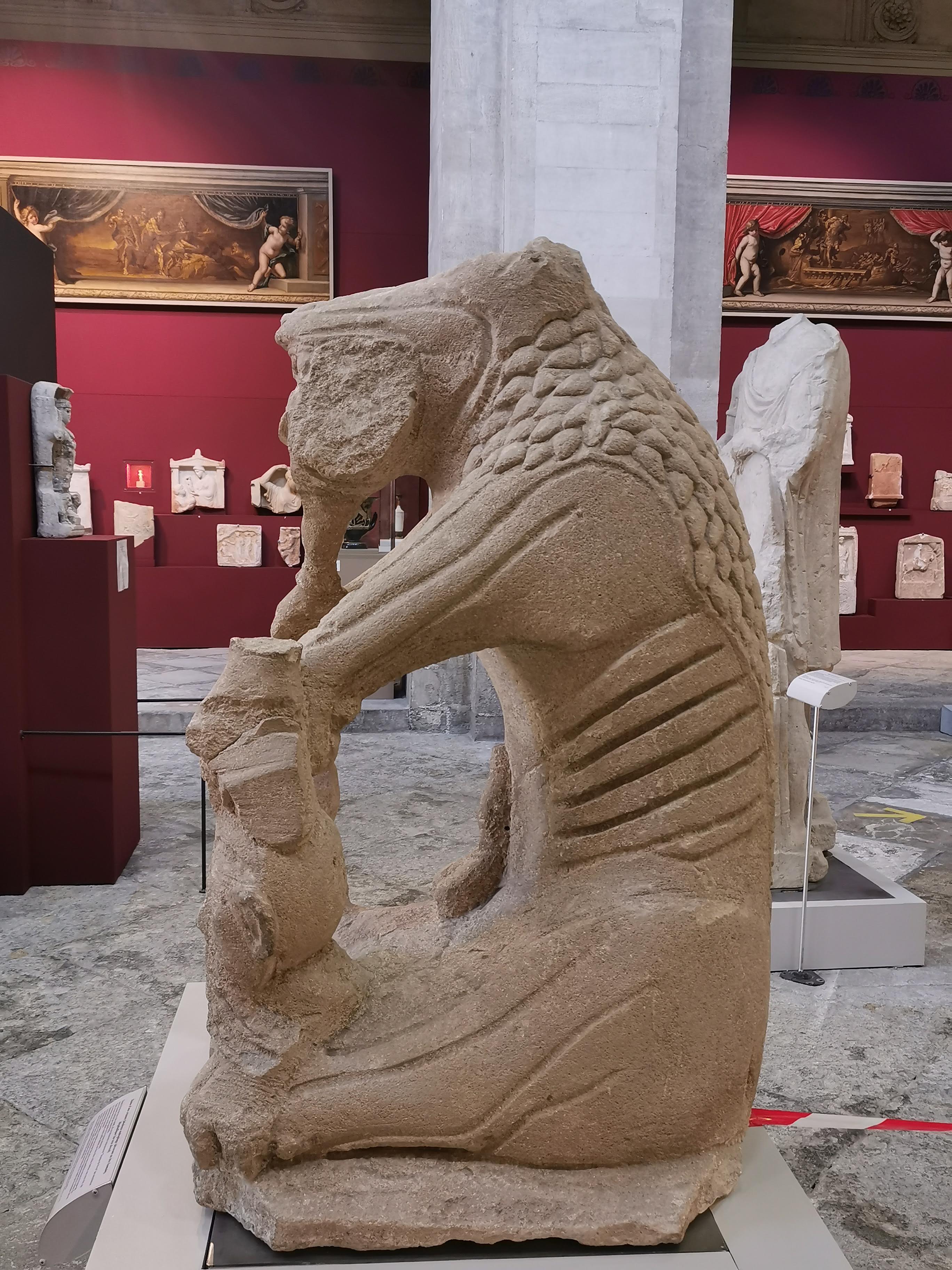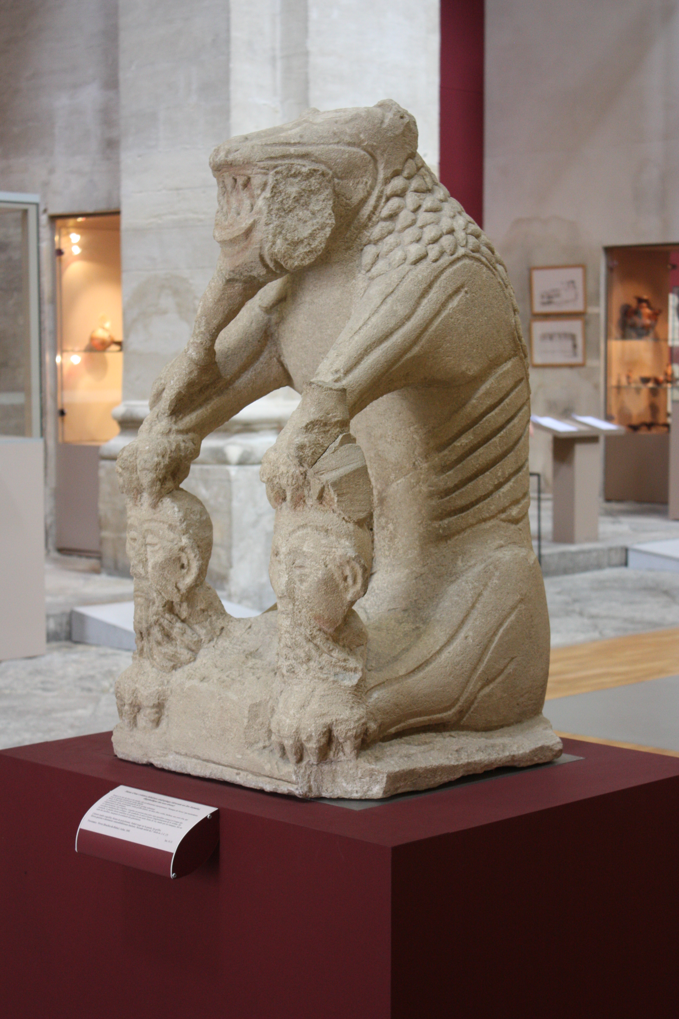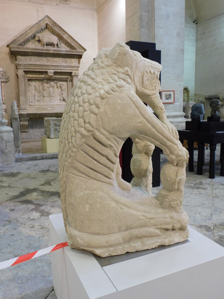 Au centre, trône la Tarasque de Noves. Cette sculpture a été trouvée en 1849 ou avant (il y a un doute) à Noves, village au sud de la Durance, face à la Chartreuse de Bompas. Elle aurait été faite vers 50 avant notre ère, bien que sa datation soit discutée. Le nom de Tarasque, un monstre féminin dompté par Sainte Marthe été choisi pour désigner cette statue. Il est surprenant. L’animal exhibe un énorme pénis et il n’y a pas de doute sur son genre masculin. Cette nomination était-elle un moyen en féminisant la bête de la rendre moins inquiétante ?