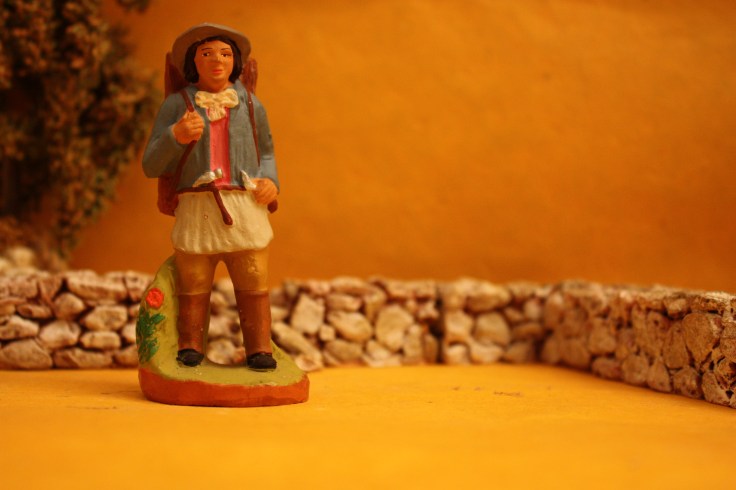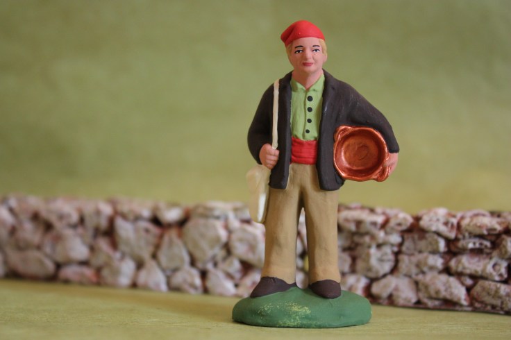 Il y a Pimpara, le rémouleur, la vedette de la crèche. C’est la pastorale Maurel qui lui a donné son nom. Il aiguise les couteaux, mais aussi tous les outils coupants : les ciseaux, les faux, les faucilles, les haches, les scies. Il circule dans les villages en appelant les clients, il va aussi jusque dans les fermes isolées. Il traine avec lui sa meule et son réservoir d’eau, il est habillé d’un grand tablier de cuir qui le protège des éclats de métal ou des étincelles.