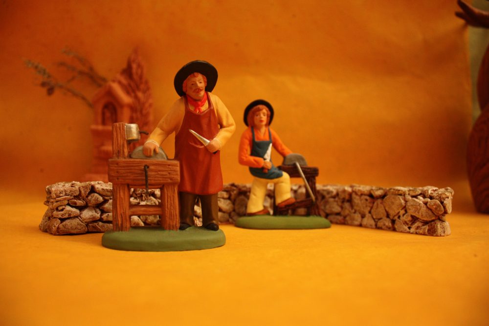 Dans ce monde passé, les santonniers placent des métiers d’autrefois. Beaucoup sont liés aux réparations d’objets ou de la maison. Le monde ancien est un monde d’énergie limitée. On n’a pas les moyens de jeter ce qui est cassé ou usé, on répare, on entretient. Tout un monde de métiers ambulants vient à la maison pour remettre en état tout type d’objets.